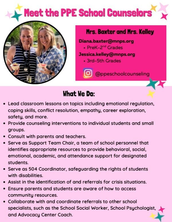 We are fortunate to have Mrs. Jessi Kelly and Mrs. Diana Baxter serving the PPE Community as School Counselors. Read more about their role and how to get in touch with them below!