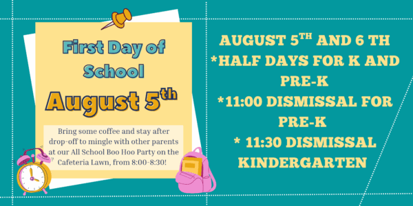 - August 6th: Half day for pre-K and Kindergarten (full day grades 1-5)