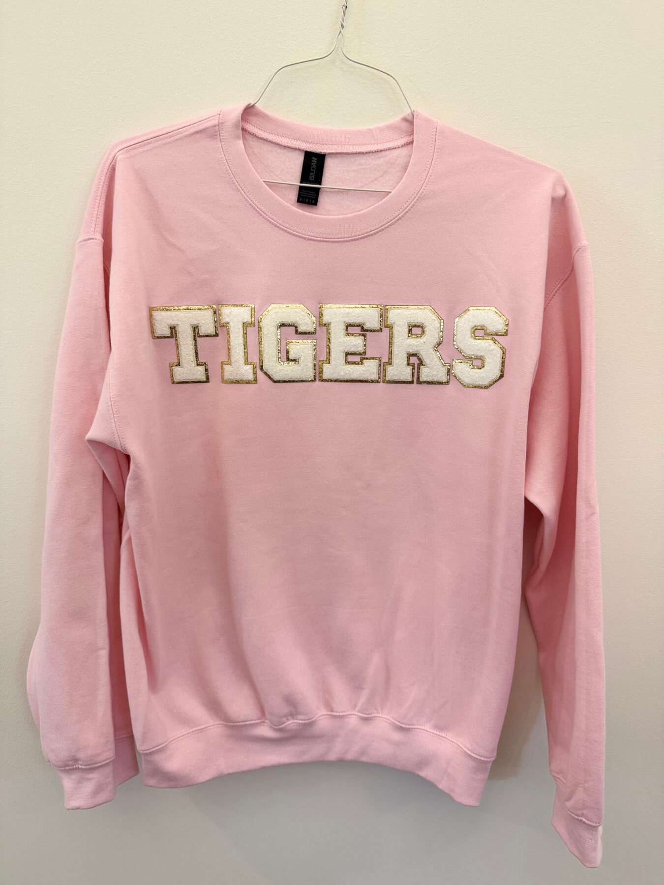 This is an adorable pink crewneck sweatshirt with white varsity-style chinelle patches, it is available in youth and adult sizes!