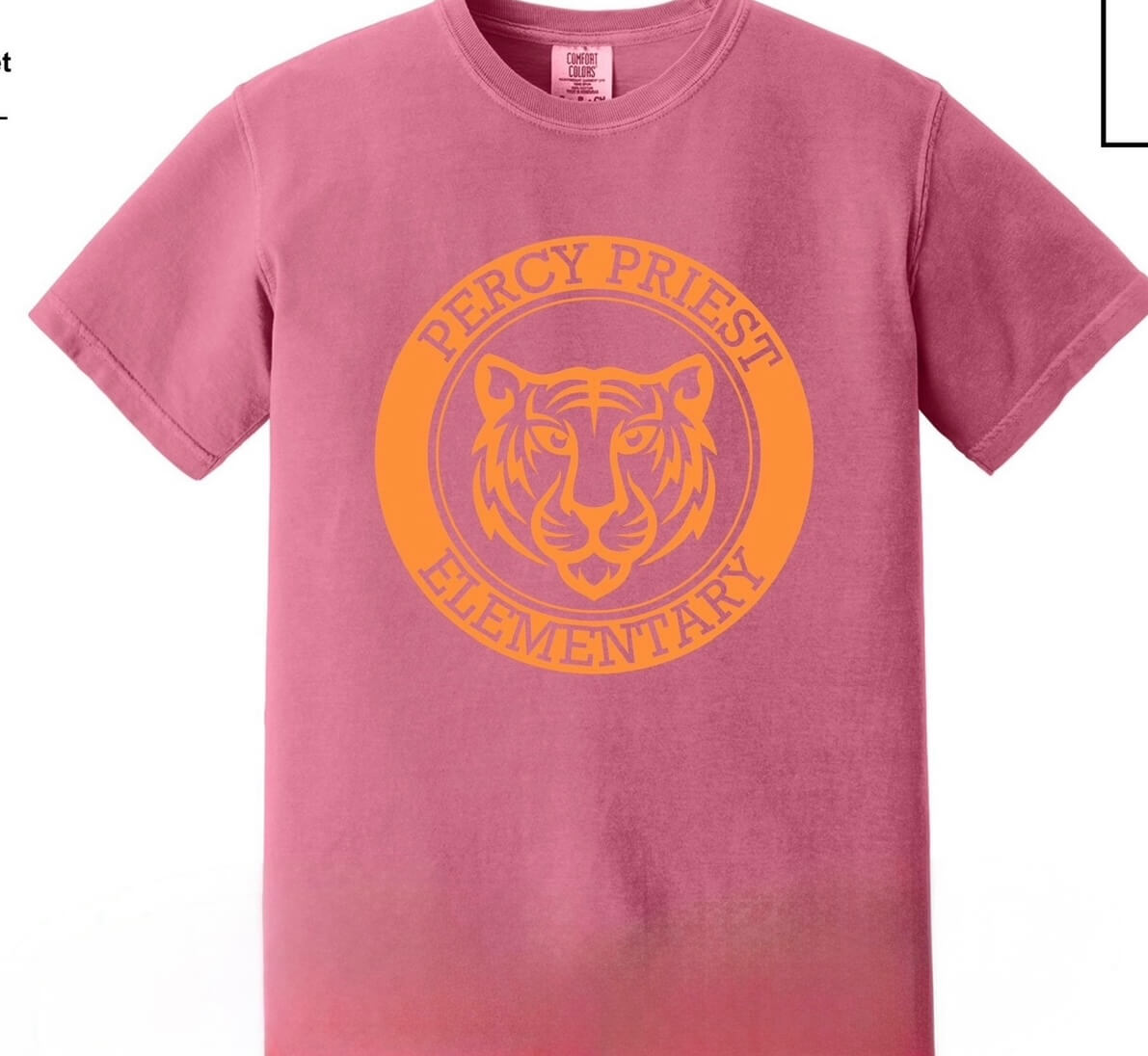 Youth & Adult pink comfort colors t-shirt with Percy Priest seal in orange.